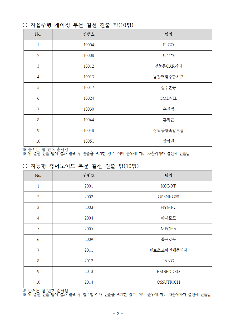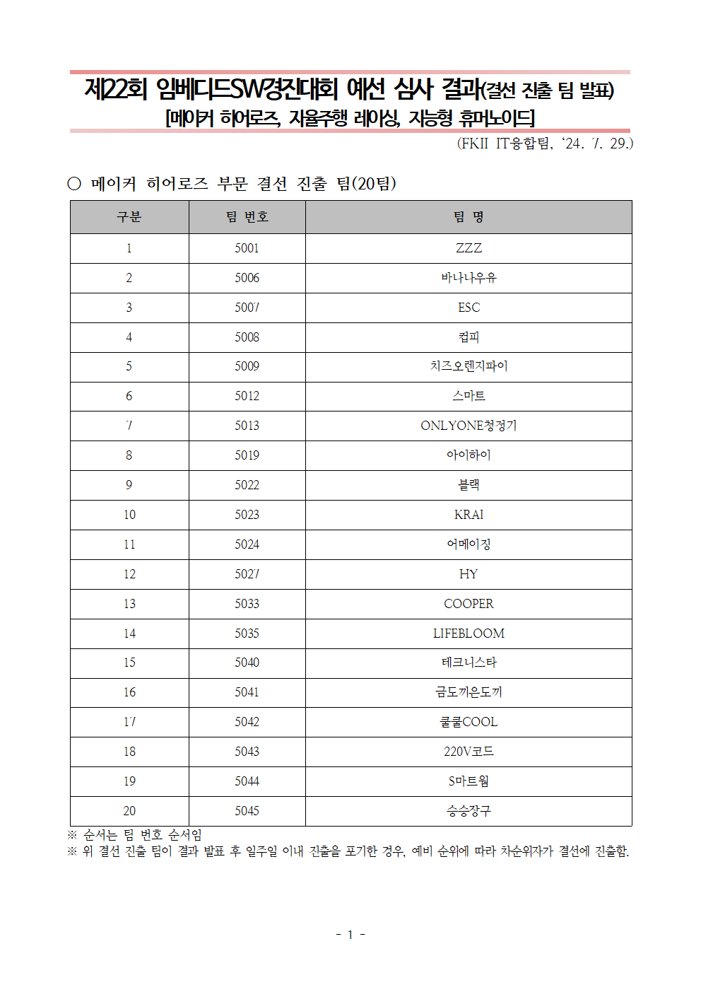 제22회 임베디드SW경진대회 메이커 히어로즈, 자율주행 레이싱, 지능형 휴머노이드 부문 예선 심사 결과 안내드립니다.