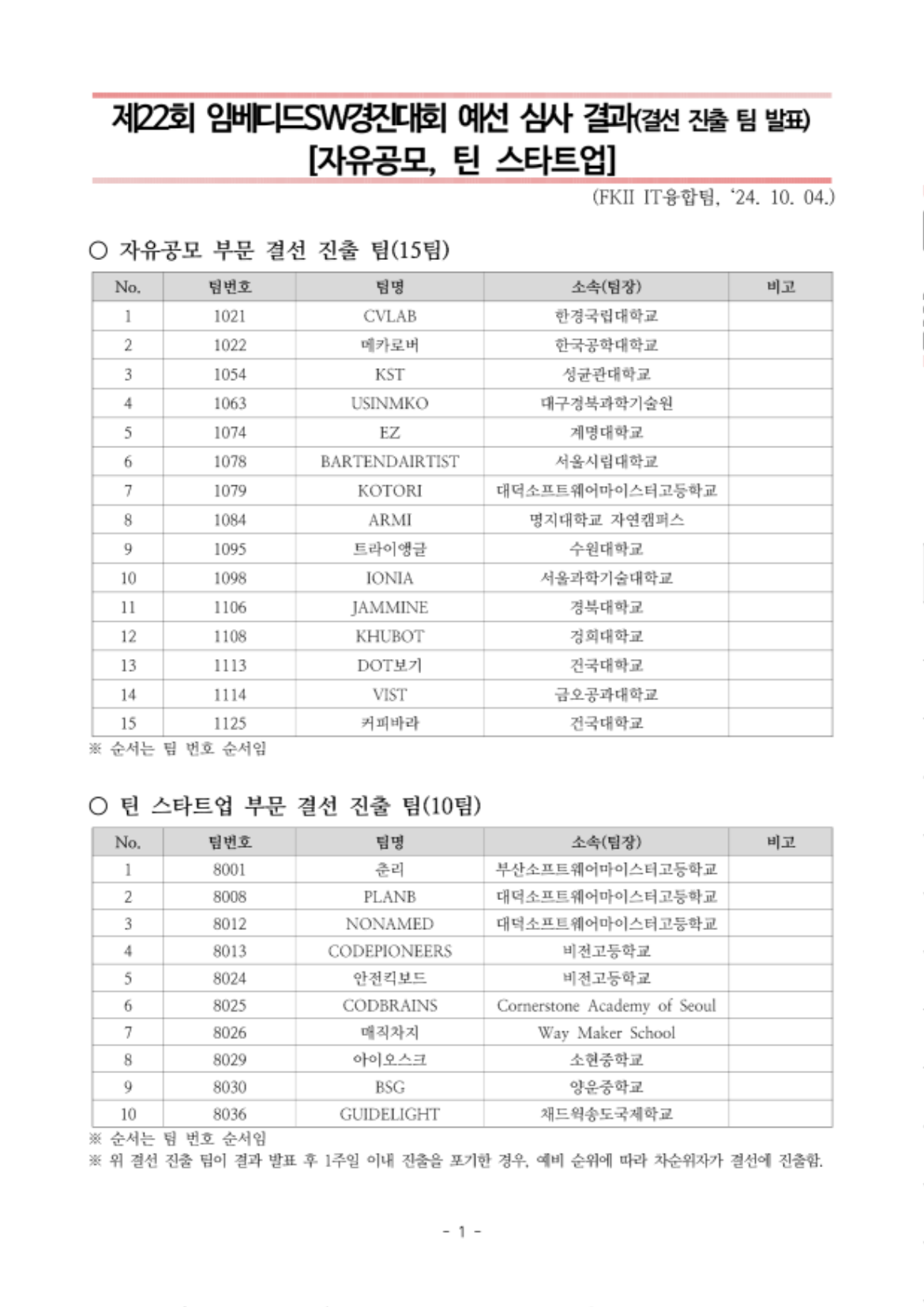 제22회 임베디드SW경진대회 자유공모, 틴 스타트업 부문 예선 심사 결과 안내드립니다.