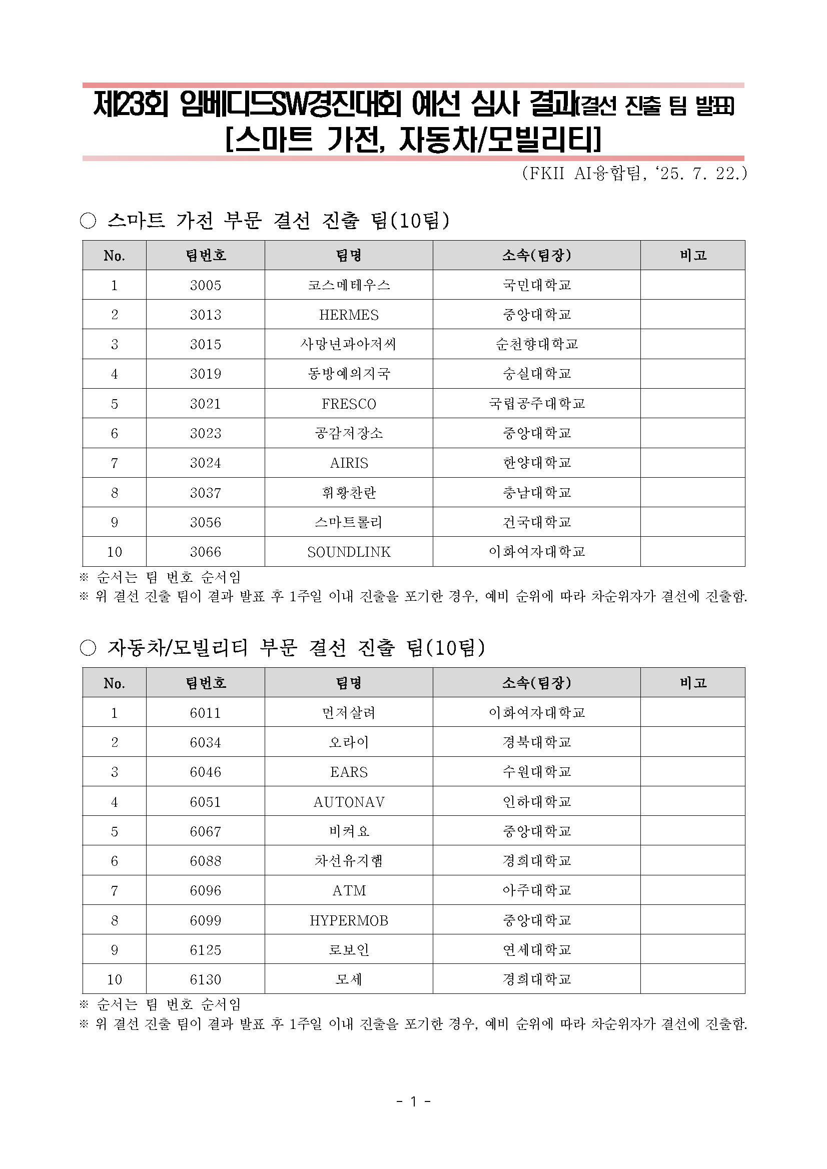 제23회 임베디드SW경진대회 스마트 가전, 자동차/모빌리티 부문 예선 결과 발표 |