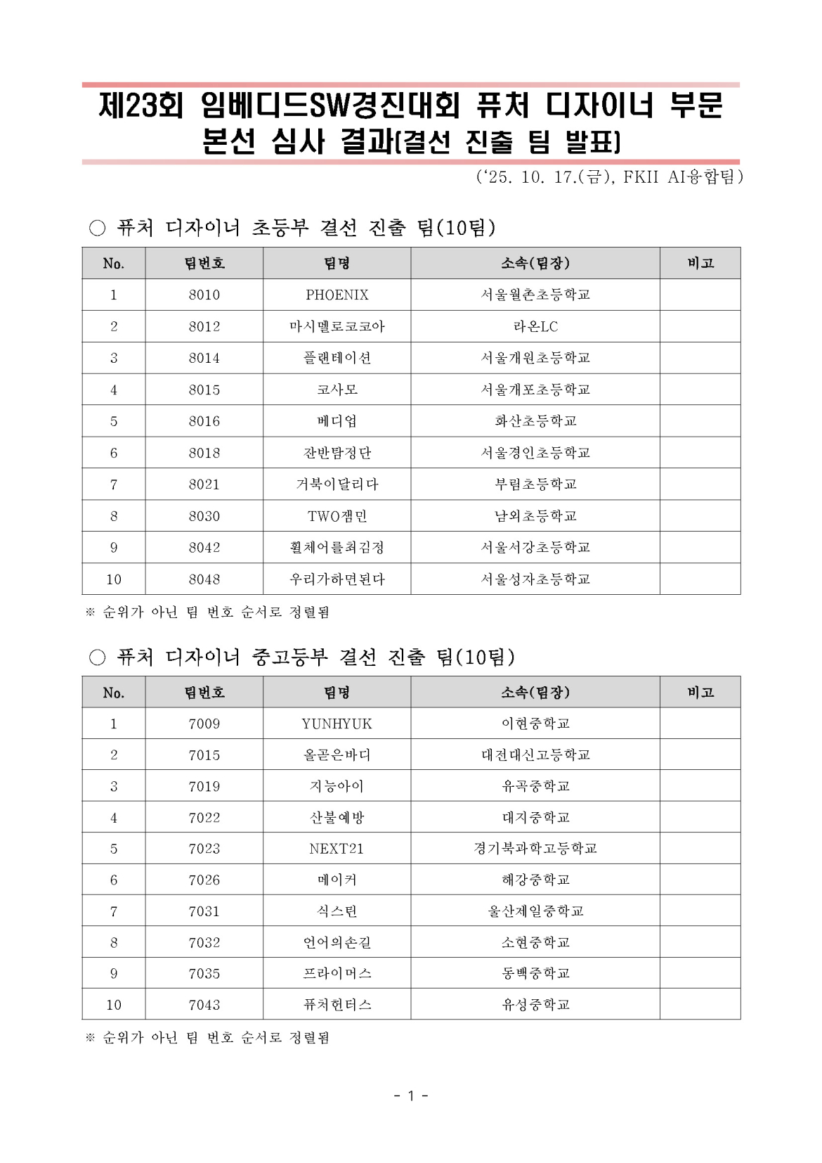 제23회 임베디드SW경진대회 퓨처 디자이너 부문 본선 심사 결과(결선 진출 팀) 안내드립니다.
